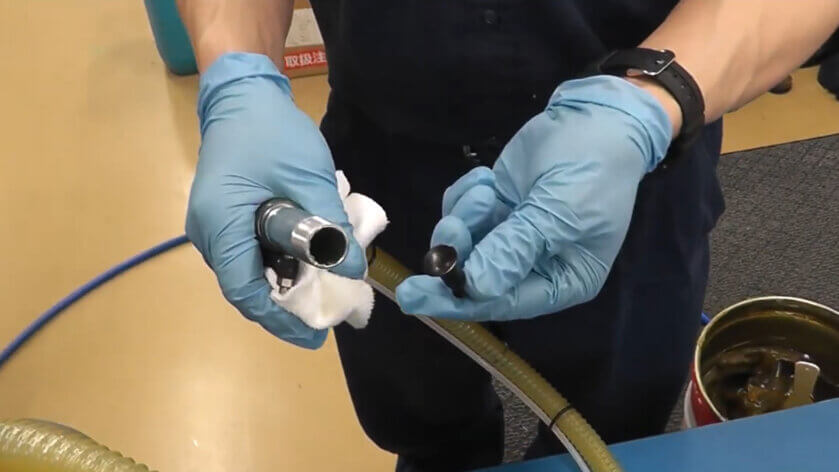 ノズル内に残ったグリースは、手袋を吸わせて取り除きます。